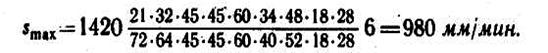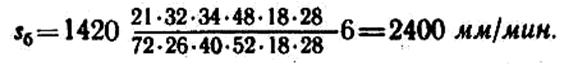 За аналогічним принципом відбувається реверсування вертикальних подач. При включенні кулачкової муфти M5 в ту або іншу сторону, обертання отримує вал XIX, який через шестерні 25—50 і конічну передачу 24—36 приводить в обертання вертикальний ходовий гвинт XXI. Найменша швидкість вертикальної подачі St min визначається з виразу: Допоміжні рухи. Швидкі переміщення столу і консолі здійснюються включенням дискової фрикційної муфти M4. При цьому вал XIII отримує обертання від електродвигуна через шестерні 21—72 і 32—64—26, обминуя коробку подач. Від шестерні 34, закріпленої на валу XIII, рух передається, як і при робочих подачах. Швидкість швидкого переміщення столу в повздовжньому напрямку Sб визначається з виразу:
