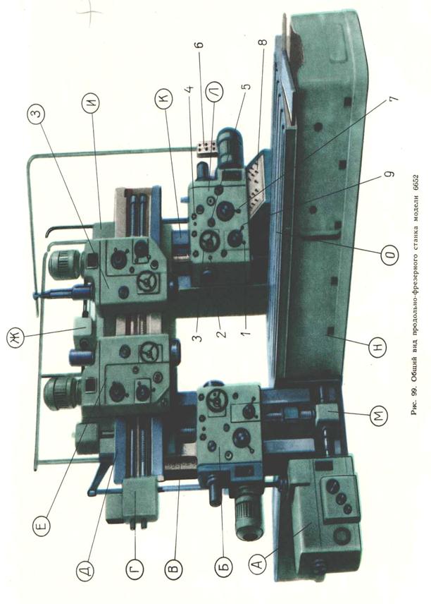 Загальна характеристика верстату МОДЕЛІ 6652 ПОВЗДОВЖНЬО-ФРЕЗЕРУВАЛЬНИЙНИЙ ВЕРСТАТ Призначення верстату. Верстат призначений для фрезерування великогабаритних заготовок або для одночасної обробки декількох деталей середніх розмірів і ваги, закріплених на столі в одну лінію. Фрезерувати можна як з однією, так відразу з двох або трьох сторін. У роботі можуть брати участь від однієї до чотирьох шпиндельних бабок Верстат застосовується в індивідуальному і серійному виробництві для обробки стали і чавуну фрезами з твердосплавними, а також швидкорізальними ножами. Розміри робочої поверхні столу, мм.................................1250X4250 Максимальний поздовжній хід столу, мм......................................4500 Максимальна вага оброблюваної заготовки, Н..........................80000 Кількість шпиндельних бабок...........................................................4 Число швидкостей обертання шпинделів....................................12 Межі чисел оборотів шпинделів за хвилину........................37,5—475 Потужність приводу в кожній з шпиндельних бабок, КВт...............20 Максимальний діаметр фрези, мм..............................................400 Межі кута нахилу ВІсі шпИнделів, град..........................................±30 Потужність приводу подач, Квт...................................................10 Межі швидкостей подач, мм/хв: шпиндельних бабок......................................................11,8—590 столу....................................................................23,5—1180 Потужність приводу швидких переміщень, КВт.............................10 Швидкість швидкого переміщення столу, мм/мін........................3500 Потужність приводу переміщення траверси, КВт..........................14 Швидкість переміщення траверси, мм/мін.....................................800 Основні вузли верстата (мал. 88). А — привод подач і швидких переміщень столу і шпиндельних бабок; Б— ліва горизонтальна шпиндельна бабка; У — ліва стійка; Г—механізм переміщення верти-кальних шпиндельних бабок; Д — траверса; Е — ліва вертикальна шпиндельна бабка; Ж — привод переміщення траверси; 3 — права вертикальна шпиндельна бабка; И — портал; К — права стійка; Л — права горизонтальна шпіндельна бабка; М — механізм переміщення горизонтальних бабок; Н — станина; О — стіл. Органи управління. / — рукоятка перемикання подвійного рухомого блоку шестерень Б1, 2 — затиски поворотної частини шпиндельної бабки; 3 — маховичок ручного переміщення гільзи зі шпинделем; 4 — затиски гільзи шпинделя; 5 — місце установки руко-ятки для ручного переміщення шпиндельної бабки; 6 - підвісний пульт управління; 7 — рукоятка управління потрійним рухомим блоком шестерень Б3; 8 — центральний пульт управління; 9 — рукоятка управління подвійним рухомим блоком шестерень Б2. Решта елементів управління верстатом гідрофіціровані. На кожній бабці є затиски для її закріплення, затиск для закріплення гільзи і фіксатор нульового положення шиінделю. Рухи у верстаті. Рухи різання — обертання кожного з чотирьох шпинделів з фрезами. Рухи подач: повздовжнє поступальне переміщення столу суміснеоз оброблюваними заготовками; вертикальне поступальне переміщення правою і лівою горизонтальних шпиндельних бабок; горизонтальне поступальне переміщення правою і лівою вертикальних шпіндельних бабок. Допоміжні рухи: швидкі переміщення столу і шпіндельних бабок у тих же напрямках; ручні переміщення шпиндельних бабок; ручні повороти шпіндельних бабок; ручні поступальні переміщення гільз зі шпинделями; вертикальне поступальне переміщення тра