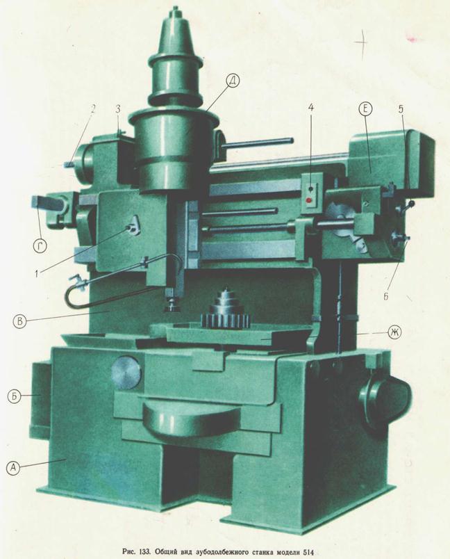 Найбільший зовнішній діаметр оброблюваних коліс, мм: із зовнішнім зачепленням................................................................500 з унутрішнім зачепленням................................................................550 Найменший зовнішній діаметр оброблюваних коліс, мм:..................20 Найбільша довжина оброблюваного зуба, мм: із зовнішнім зачепленням...........................................................105 з унутрішнім зачепленням....................................................75 Межі модулів зубів коліс, що нарізуються по сталі, мм......... 2—6 Межі чисел подвійних ходів довбака у хвилину............125—359 Найбільший кут нахилу гвинтового зуба, град........................ 23 Найбільший хід довбака, мм.......................... 125 Межі величин кругових подач на подвійний хід довбака, мм............................................. 0,17-0,44 Потужність головного електродвигуна, КВт.........................2,8 Основні вузли верстата (мал. 91, 92). А - нижня частина станини; Би — ділильна гітара; У — верхня частина станини; Г — кривошипно-шатунный механізм приводу шпинделя з довбаком; Д — головка шпинделя; Е — механізм радіальної подачі головки шпинделя; Ж — стіл. Органи управління. / — квадрат для ручного переміщення головки шпинделя; 2— квадрат для ручного провороту довбака і заготовки; 3 — важіль для зміни напрямку обертання довбака і заготовки; 4 — кнопкова станція; 5 — важіль включення радіальної подачі довбака; 6 — квадрат для ручного провороту кулачку радіальної подачі довбака. Рухи у верстаті. Рух різання — прямолінійний зворотньо-поступальний рух шпинделя (штоселя) з довбаком. Рухи подач — обертання довбака навколо своєї вісі (колова подача) і радіальне переміщення штоселя під час врізання (радіальна подача) за чверть оберта заготовки.