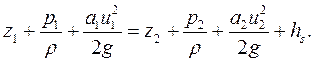 где М— масса жидкости; и и v —соответственно истинная и средняя скорости. Обычно в трубопроводах и каналах a = 1,05... 1,1. Иногда приближенно принимают a» 1. Поэтому для потока вязкой жидкости с учетом неравномерности распределения скоростей по живому сечению уравнение Бернулли запишется следующим образом: