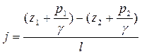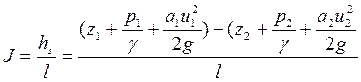 Падение полной удельной энергии жидкости вдоль потока, приходящегося на единицу его длины l, называют гидравлическим уклоном J и определяют по формуле