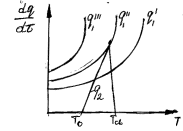 где: α – коэффициент теплоотдачи; S – площадь поверхности стенок сосуда. Тогда изменение подвода и отвода тепла в зависимости от температуры можно проиллюстрировать следующим образом (рис. 22):