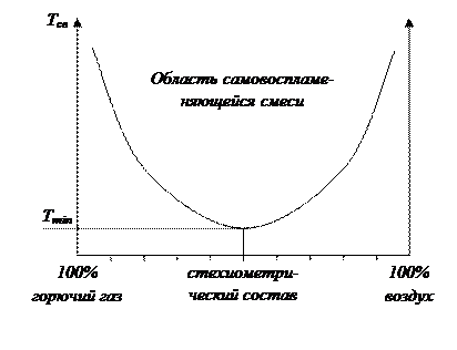 Тут Условия самовоспламенения предельного состава горючей смеси пока-зана на кривых Зависимость температуры самовоспламенения от состава горючей сме-си показана на рисунке 24. Минимальная Тсв характерна для стехиометриче-ских смесей.