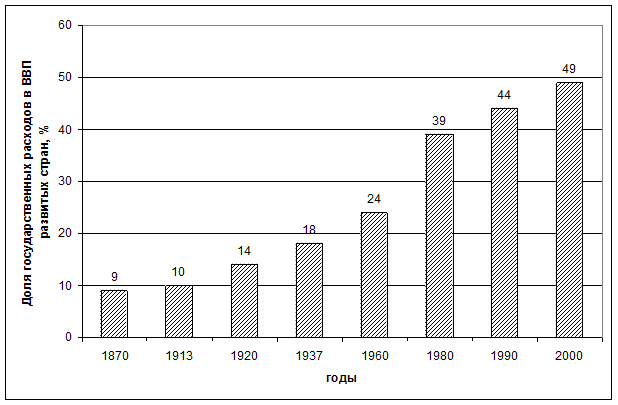 Историю развития государственного сектора в развитых странах (с середины 20 в. до начала 21 в.) можно условно разделить на несколько этапов: 1) после 2 мировой войны («максималистское государство», пик развития государственного сектора); 2) середина 1970-х-конец 1990-х («минималистское государство», наименьший уровень развития); 3) начало нынешнего столетия («эффективное государство», стабилизация роли государственного сектора, рост производства социальных и экономических услуг). Концепция «эффективного государства» включает в себя следующие важные идеи: - Государство находится в центре экономического развития, но не как непосредственный источник роста, а как партнер, катализатор и помощник. - В деятельности государства акцент смещается с количественного аспекта экономической деятельности к качественному аспекту В истории рыночной экономики 19-20 веков в целом наблюдается усиление экономической роли государства. Об этом свидетельствует колоссальный рост государственных расходов и доходов, увеличение доли государства в перераспределении национального дохода (см.рис.4.1). Следует отметить, что эти расходы увеличивались и в 80-90 годы 20-го века, когда в этих странах интенсивно развивался процесс разгосударствления и приватизации. Отмеченная тенденция в целом относится и к экономике таких стран, как США и Великобритания. Если в 20-е годы 20 века доля госрасходов в ВВП этих стран составляет около 20%, то в 2000 году она выросла до 29%, а в Великобритании – до 40%. В России – 28% ВВП в 2000 году.