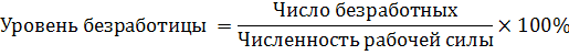 где Уа – уровень экономически активного населения; Н – общая численность населения; Эн – экономически неактивное население. В нашей стране уровень экономически активного населения составляет порядка 50%. В свою очередь экономически активное население делится на две группы: занятые и безработные. В категорию занятых включается взрослое трудоспособное население, имеющее работу. Безработица – экономическое состояние, которое характеризуется тем, что часть взрослого трудоспособного населения не имеет работы находится в ее поисках. Общая численность занятых и безработных составляет рабочую силу. Основным показателем, измеряющим безработицу, является «уровень безработицы». Уровень безработицы – процентное отношение числа безработных к численности рабочей силы: