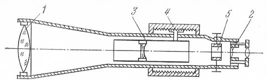 Зрительная труба – это увеличительный прибор для наблюдения удаленных объектов. Астрономическая труба дает обратное изображение, земная – прямое. Основными частями зрительной трубы является: объектив 1, окуляр 2, внутренняя фокусирующая линза 3, которая перемещается внутри трубы вращением кремальеры 4 (кремальерного винта или кольца) и сетки нитей 5. Объектив и окуляр трубы располагают т.о. чтобы при установке трубы на бесконечность передний фокус окуляра совпадал с задним фокусом объектива и плоскостью сетки нитей. В окулярной части трубы находится сетка нитей на которую проектируется изображение наблюдаемого предмета, между объективом и окуляром располагается двояковогнутая фокусирующая линза, которая перемещается при помощи кремальеры. Зрительная труба имеет 3 основные оси. – визирная ось, (мнимая ось) проходит через оптический центр объектива и крест нитей сетки; вертикальная плоскость, проходящая через визирную ось, называется коллимационной. – оптическая ось проходит через центр объектива и окуляра. – геометрическая ось – прямая проходящая через центры поперечных сечений объективной части трубы. При установке зрительной трубы по глазу необходимо получить отчетливое изображение сетки нитей и наблюдение объекта, для этого зрительную трубу наводят на светлый фон и вращением окулярного кольца добиваются отчетливого изображения сетки нитей. Для наведения резкости на предмет при помощи кремальеры перемещают фокусирующую линзу до совпадения изображения предмета с плоскостью сетки нитей. После установки зрительной трубы следует убедиться в отсутствии параллакса сетки нитей – кажущегося смещения изображения относительно сетки при перемещении глаза наблюдателя относительно окуляра, устраняется дополнительной фокусировкой. Увеличение зрительной трубы это отношение угла под которым предмет виден в зрительную трубу к углу, под которым предмет виден невооруженным глазом, на практике за увеличение зрительной трубы принимают соотношение фокусного расстояния объектива и окуляра.