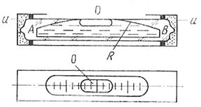 На верхней поверхности ампулы нанесены деления – середина нуль–пункт. Внутренняя и верхняя поверхность ампулы представляет собой дугу большего радиуса. Касательная к внутренней и верхней поверхности ампулы, проходящий через нуль–пункт, называется осью уровня.