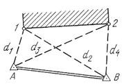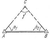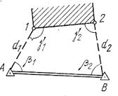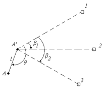 4. Обратная угловая засечка. На местности определяется приближенное положение точки А = А', устанавливают над ней теодолит и измеряют углы β1 и β2. Вычисляют координаты точки А':