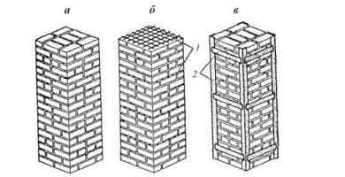 Рис. 3.26. Кирпичные столбы: а — неармированный; б — армированный сеткой; в — усиленный стальной обоймой; 1 — проволочная сетка; 2 — обойма из уголков и планок