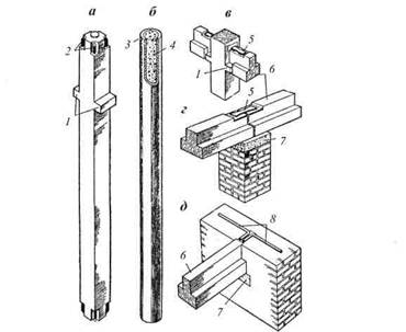 Рис. 3.27. Колонны, стойки и прогоны: а — железобетонная колонна; б — стойка из асбестоцементной трубы; в — опирание прогона на колонну; г — то же на кирпичный столб; д — то же на стену; 1 — консоль; 2 — выпуски арматуры; 3 — асбестоцементная труба; 4 — монолитный бетон; 5 — стальная накладка; 6 — ригель таврового сечения; 7 — железобетонная подушка; 8 — анкеры, заделываемые в кладку