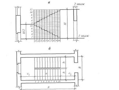 Рис. 3.57. Схема разбивки лестницы: а — в разрезе; б — в плане