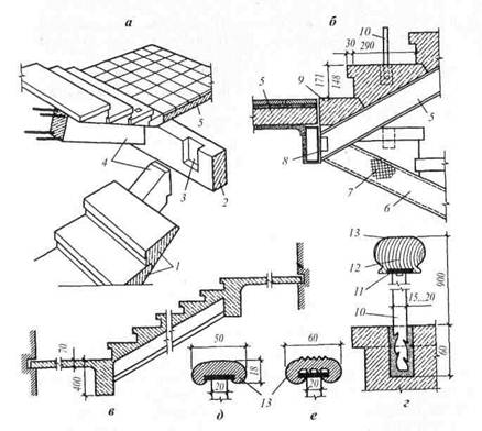 Рис. 3.58. Конструкции лестниц: а — сборная из железобетонных мелкоразмерных элементов; б — по стальным косоурам; в — монолитная железобетонная; г — заделка стоек и крепление деревянного поручня; д, е — крепление пластмассовых поручней; 1 — ступени; 2 — площадочная балка; 3 — гнездо для конца косоура; 4 — косоур сборный железобетонный; 5 — плита лестничной площадки; 6 — стальной косоур; 7 — штукатурка по стальной сетке; 8 — стальная площадочная балка; 9 — фризовая ступень;10 — стойка перил; 11 — стальная полоса; 12 — шурупы; 13 — поручень исло проступей в одном марше будет на единицу меньше числа подступенков, так как верхняя проступь располагается на лестничной площадке: и- 1 = 11 - 1 = 10. Длина горизонтальной проекции марша, называемая его заложением, ' равна я = 300х(я- 1) = 3000 мм. Принимаем ширину междуэтажной площадки С; = 1300 мм, этажной — 1 С2 = 1300 мм; получим, что полная длина лестничной клетки составит А = а+ С, + С2 = 3000+ 1300+ 1300 = 5600 мм. Если выход из лестничной клетки наружу расположен под пер- | вой междуэтажной площадкой, то, чтобы обеспечить под ней свободный проход высотой не менее 2 м, уровень пола первого этажаШ делают выше пола входной площадки на несколько ступеней с уст- I ройством цокольного марша. Графическое построение лестницы выполняют следующим об- 1 разом. Высоту этажа делят на части, равные числу подступенков в этаже, через полученные точки проводят горизонтальные прямые. | Затем горизонтальную проекцию (заложение марша) делят на число I проступей без одной и через полученные точки проводят вертикальные прямые. По полученной сетке вычерчивают профиль лестницы. Конструкции железобетонных лестниц По способу устройства лестницы могут быть сборными и монолитными. Сборные выполняют из мелко- и крупноразмерных элементов (рис. 3.58). Лестницы из мелкоразмерных элементов состоят из отдельно устанавливаемых железобетонных сборных площадочных балок, сборныхжелезобетонных косоуров, ступеней, железобетонных плит площадок и ограждений с поручнями. Для сопряжения косоуров с площадочными балками в последних предусмотрены гнезда, в которые заводятся концы косоуров. Связь между элементами лестниц достигается, как правило, сваркой закладных деталей. Ступени укладывают по косоурам на цементном растворе. На площадочные балки опирают сборные железобетонные площадочные плиты. Лестницы из крупноразмерных элементов состоят из площадок и маршей заводского изготовления (рис. 3.59) или маршей с полуплощадками. Сборные элементы устанавливают на место кранами и крепят с помощью сварки закладных деталей. Лестничные площадки своими концами обычно опирают на боковые стены лестничной клетки, а в крупнопанельных зданиях — на специальные металлические элементы (столики), привариваемые к закладным деталям в стеновых панелях лестничной клетки. Ограждение лестниц чаще всего состоит из стальной решетки, выполненной на сварке или клепке, с деревянным или пластмассовым поручнем, высотой 0,9—0,95 м. Стойки решеток крепят в гнездах ступеней или приваривают к закладной детали в торце ступени. В гнезде стойку расклинивают мелким щебнем и заливают высокопрочным цементным раствором. Внутриквартирные деревянные лестницы устраивают на косоурах и тетивах (рис. 3.60). Тетивы могут быть врезные (проступи и подступенки вставляются в прорези глубиной 15—25 мм) и с прибои-нами, 