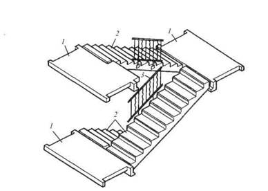 Рис. 3.59. Лестница из крупносборных элементов: 1 — лестничные площадки; 2 — лестничные марши; 3 — фрагмент ограждения Внутриквартирные деревянные лестницы Лестницы-стремянки (служебные) для попадания с верхней площадки лестничной клетки на чердак или на совмещенную крышу выполняются из профилированного металла (тетивы) и стержней