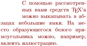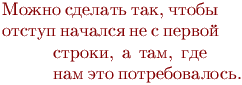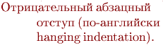 Здесь TeX'овский параметр \hangindent означает величину отступа от полей во всех строках абзаца, кроме первой (по умолчанию значение этого параметра равно нулю). Обратите внимание, что мы начали абзац командой \noindent, чтобы первая строка не началась с абзацным отступом (см. разд.Подавление стандартного отступа). Пусть теперь нам хочется, чтобы дополнительный отступ, величина которого задана параметром \hangindent, начинался не со второй строки, а, скажем, с третьей. Для этого надо установить еще один TeX'овский параметр, обозначаемый \hangafter: