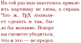 Значение параметра \hangafter — номер строки, после которой начинается дополнительный отступ. По умолчанию значение \hangafter равно единице (как и было в нашем первом примере). Можно также добиться того, чтоб дополнительный отступ не начинался после какой-то строки, а напротив, присутствовал только в нескольких первых строках абзаца. Для этого надо присвоить параметру \hangafter отрицательное значение: если величина \hangafter равна