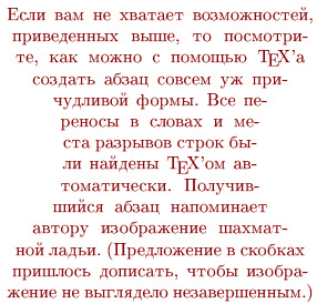 Начало этого причудливого абзаца выглядело в исходном тексте так: \parshape=14 0cm 6cm.1cm 5.8cm.17cm 5.66cm.5cm 5cm .9cm 4.2cm 1.05cm 3.9cm 1.1cm 3.8cm 1.1cm 3.8cm 1.05cm 3.9cm.9cm 4.2cm.5cm 5cm.17cm 5.66cm .1cm 5.8cm 0cm 6cm \noindent \small Если вам не хватает возможностей... Смысл этого текста следующий. Число После пустой строки или команды \par действие параметров, заданных командой \parshape, прекращается. У абзаца, форма которого задана с помощью \hangindent или \parshape, длина и отступ строки зависят, как вы могли заметить, от ее номера. Если такой абзац содержит выключную формулу, то TeX считает, что эта формула занимает три строки, причем сама формула расположена в средней из этих трех (реально формула может, разумеется, занимать больше места).