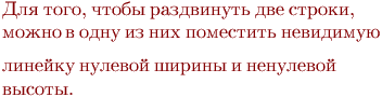 Для того, чтобы раздвинуть две строки, можно в одну из них поместить невидимую линейку\rule{0pt}{5mm} нулевой ширины и ненулевой высоты. Один частный случай линейки нулевой ширины настолько важен, что в TeX'е и LaTeX'е для такой линейки предусмотрена специальная команда \strut. Невидимая линейка, создаваемая этой командой, имеет нулевую ширину; высота же ее установлена автором LaTeX'а с таким расчетом, чтобы она была чуть выше максимальной высоты букв текущего шрифта и опускалась ниже уровня строки настолько, насколько могут опускаться буквы текущего шрифта. Например, в прямом светлом шрифте кегля 11 команда \strut создает линейку ширины 0, поднимающуюся над уровнем строки на 9.52pt и опускающуюся ниже уровня строки на 4.08 pt. Линейки нулевой ширины и ненулевой высоты действуют подобно команде \vspace*. Смысл невидимых линеек в том, что они позволяют создать вертикальные или горизонтальные пробелы в таких ситуациях, когда \vspace или \hspace не помогают. Вот пример ситуации, когда возникает нужда в невидимых линейках. Пусть в нашем тексте мы