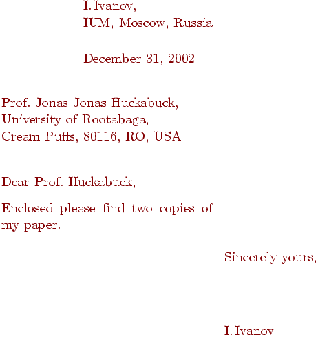 Между \begin{document} и \end{document} идет собственно текст письма или писем (в одном LaTeX'овском файле можно поместить несколько писем от одного отправителя). Каждое письмо оформляется как окружение {letter}, принимающее один обязательный аргумент — адрес того, кому предназначено письмо (опять-таки адрес можно разбивать на строки командами \\). Внутри окружения {letter} располагается собственно текст письма. Начинаться он должен командой \opening, в аргументе которой записывается вступительное обращение, а завершаться — командой \closing, в аргументе которой записывается заключительная фраза перед подписью (" Sincerely yours", например). Выше приведен пример оформленного по всем правилам LaTeX'овского файла с письмом, а затем — то, как будет выглядеть это письмо на печати. Вертикальный отступ на печати между текстами, заданными в командах \closing и \signature (в нашем случае — между " Sincerely yours" и "I.Ivanov" предназначен для того, чтобы поставить в этом месте подпись.