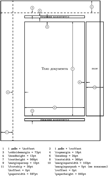 то отступ от края бумаги составит (вспомним, что один дюйм равен ). Если присвоить параметру \oddsidemargin отрицательное значение, то расстояние от края листа до начала текста будет, соответственно, меньше дюйма. Нелишне также напомнить, что когда вы присваиваете параметру со значением длины нулевое значение, то все равно должна быть указана какая-то единица длины (как у нас в примере); запись наподобие