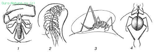 Мал. 12. Ложногомойотермниє членистоногі – мешканці печер: 1 – лжескорпіон; 2 – багатоніжка; 3 – коник; 4 – жужелиця Для характеристики організмів за основними джерелами використовуваного тепла використовують терміни эктотермный і эндотермный. Ектотермія – це життя переважно за рахунок нагрівання із зовнішнього середовища, эндотермия – за рахунок тепла, що виробляється самим організмом. Масштаби вироблення тепла сильно відрізняються в різних видів, проявляючи залежність від складності організації групи, можливостей окислювальних реакцій, розмірів і маси тіла, умов середовища і інших причин. Так, наприклад, бактерії виділяють на грам ваги в годину близько 450 кал, мухи‑дрозофилы – 30, миші – 8, для людини цей показник дорівнює 4. В межах хребетних тварин при схожій масі тіла ссавці продукують в 5–6 разів, а птиці – в 7–8 разів більше тепла, чим рептилії. Всі живі організми потенційно эндотермны, але сильно розрізняються по рівню обміну і можливостям збереження тепла. Порушення теплового балансу міняють температуру тіла. Відновити порушений баланс можна трьома дорогами: 1) зміною теплопродукции, 2) зміною тепловіддачі і 3) переміщенням в просторі в область температур, що віддаються перевага. Пойкілотермні і гомойотермные організми по‑разному реалізують можливості температурних адаптацій.
