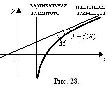 6) Наклонные и горизонтальные асимптоты. Асимптотой кривой, имеющей бесконечную ветвь, называется прямая, расстояние до которой от текущей точки М кривой стремится к нулю при удалении точки М от начала координат (рис. 28). Если график функции