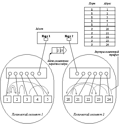 Несмотря на появление новых дополнительных возможностей основной функцией концентраторов остается передача пакетов по общей разделяемой среде. Коллективное использование многими компьютерами общей кабельной системы в режиме разделения времени приводит к существенному снижению производительности сети при интенсивном трафике. Общая среда перестает справляться с потоком передаваемых кадров и в сети возникает очередь компьютеров, ожидающих доступа. Это явление характерно для всех технологий, использующих разделяемые среды передачи данных, независимо от используемых алгоритмов доступа (хотя наиболее страдают от перегрузок трафика сети Ethernet с методом случайного доступа к среде). Поэтому сети, построенные на основе концентраторов, не могут расширяться в требуемых пределах - при определенном количестве компьютеров в сети или при появлении новых приложений всегда происходит насыщение передающей среды, и задержки в ее работе становятся недопустимыми. Эта проблема может быть решена путем логической структуризации сети с помощью мостов, коммутаторов и маршрутизаторов. Мост (bridge), а также его быстродействующий функциональный аналог - коммутатор (switching hub), делит общую среду передачи данных на логические сегменты. Логический сегмент образуется путем объединения нескольких физических сегментов (отрезков кабеля) с помощью одного или нескольких концентраторов. Каждый логический сегмент подключается к отдельному порту моста/коммутатора (рис. 1.10). При поступлении кадра на какой-либо из портов мост/коммутатор повторяет этот кадр, но не на всех портах, как это делает концентратор, а только на том порту, к которому подключен сегмент, содержащий компьютер-адресат. Разница между мостом и коммутатором состоит в том, что мост в каждый момент времени может осуществлять передачу кадров только между одной парой портов, а коммутатор одновременно поддерживает потоки данных между всеми своими портами. Другими словами, мост передает кадры последовательно, а коммутатор параллельно. (Для упрощения изложения далее в этом разделе будет использоваться термин "коммутатор" для обозначения этих обоих разновидностей устройств, поскольку все сказанное ниже в равной степени относится и к мостам, и к коммутаторам.) Следует отметить, что в последнее время локальные мосты полностью вытеснены коммутаторами. Мосты используются только для связи локальных сетей с глобальными, то есть как средства удаленного доступа, поскольку в этом случае необходимость в параллельной передаче между несколькими парами портов просто не возникает.