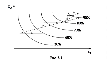 Пунктирной линией показано движение методом крутого восхождения, а сплошной — методом покоординатного подъема. Из рисунка видно, что при использовании метода крутого восхождения путь, который необходимо найти экспериментатору, значительно сокращается. С возрастанием числа факторов эффект от применения метода крутого восхождения значительно повышается. Практическое применение методов связано с принятием решений после построения линейной модели и после крутого восхождения.