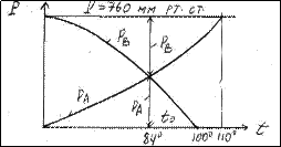 Для определения температуры перегонки применяют график зависимости парциального давления пара компонента от температуры (для воды – обратная зависимость). График представлен на рис. 129.