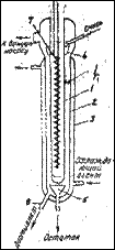 1.Ротор центрифужного типа. 2.Ввод исходной смеси. 3.Электронагреватель. 4.Первый конденсатор. 5.Второй конденсатор. б,7.Поддоны под первым и вторым конденсаторами соответственно. 8.Кольцевой приемник. 9.Отводной желоб. 10. Концентрические изоляционные плиты. 11.Корпус аппарата.