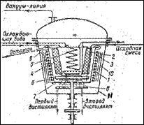 Молекулярная перегонка. Процесс протекает в глубоком вакууме при остаточном давлении (10-3-10-4 мм рт. ст.) или 13-130 МПа. Такой вакуум создаётся форвакуумными насосами (первая ступень) и диффузионно-конденсационными насосами (последние ступени). Схемы установок для молекулярной перегонки представлены на рис.130-132.