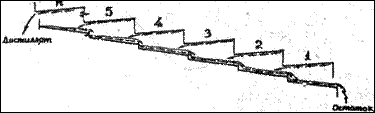 Более совершенным считается центробежный аппарат (рис.131), в котором исходная смесь поднимается в виде плёнки внутри вращающегося ротора. Ротор обогревается излучением и является испарителем. Два конденсатора располагаются в центре аппарата и позволяют получить два дистиллята. Для разделения сложных смесей применяют многоступенчатую дистилляцию (рис.132). Молекулярной дистилляцией обрабатываются: витамины, жирные кислоты, спирты, эфиры, аминокислоты, гормоны и др. – с производительностью до 1000 кг/ч.