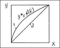 1-кривая равновесия, 2-диагональ диаграммы, У,Х - концентрации л/л компонента в паровой и жидкой фазах, мольные доли или %.