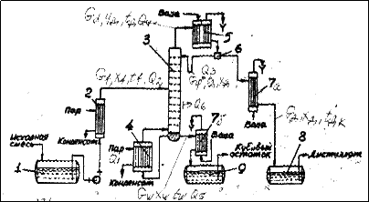 1.Емкость для исходной cмеси. 2.Подогреватель. 3.Колонна. 4.Кипятильник. 5.Дефлегматор. 6.Делитель флегмы. 7.Холодильник. 8.Сборник дистиллята. 9.Сборник кубового остатка.