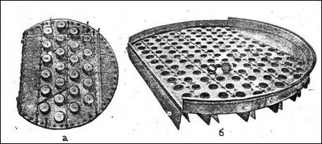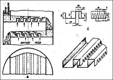 Рис.148. Тарелка (а) с направленным током жидкости вдоль туннельных колпачков с прорезями и отгибами специальной формы, еёконтактный элемент (б) и направление движения жидкости (а).