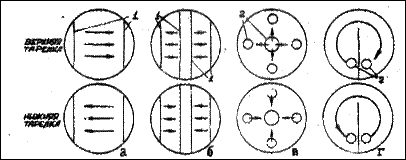 Рис.149. Некоторые типы переливных устройств тарельчатых колонн: а - однопоточное устройство со сливными перегородками (1); б - двухпоточное устройство со сливными перегородками (1); в - устройство для радиального направления жидкости с переливными трубами (2); г - устройство для кругового направления жидкости с переливными трубами (2).