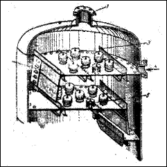 Рис.151. Две верхние тарелки колонны с капсульными колпачками. 1.Штуцер для выхода газа (пара); 2.Переточная перегородка;