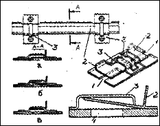 Рис. 153. Прямоугольный клапан. 1.Прорезь в тарелке. 2.Клапан (а - при малом; б - при среднем;