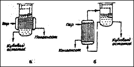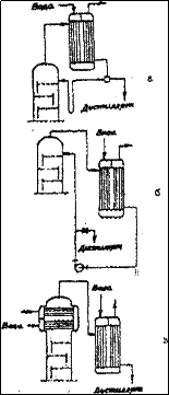 Рис. 158. Варианты работы и расположения дефлегматоров: а - с полной конденсацией и подачей флегмы самотеком; б - с полной конденсацией и подачей флегмы насосом; в - с частичной конденсацией паров.