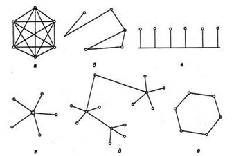 Объединяя в сеть несколько компьютеров, необходимо решить, каким образом соединить их друг с другом, другими словами, выбрать способ организации физических связей, то есть топологию. Рассмотрим некоторые, наиболее часто встречающиеся топологии. Полносвязная топология (рис. 4.1, а) соответствует сети, в которой каждый компьютер сети связан со всеми остальными. Все другие варианты основаны на неполносвязных топологиях, когда для обмена данными между двумя компьютерами может потребоваться промежуточная передача данных через другие узлы сети. Ячеистая топология получается из полносвязной путем удаления некоторых возможных связей (рис. 4.1, б). В сети с ячеистой топологией непосредственно связываются только те компьютеры, между которыми происходит интенсивный обмен данными, а для обмена данными между компьютерами, не соединенными прямыми связями, используются транзитные передачи через промежуточные узлы. Ячеистая топология допускает соединение большого количества компьютеров и характерна, как правило, для глобальных сетей. Общая шина (рис. 4.1, в) является очень распространенной (а до недавнего времени самой распространенной) топологией для локальных сетей. В этом случае компьютеры подключаются к одному коаксиальному кабелю по схеме «монтажного ИЛИ». Передаваемая информация может распространяться в обе стороны. Топология звезда (рис. 4.1, г, д). В этом случае каждый компьютер подключается отдельным кабелем к общему устройству, называемому концентратором, который находится в центре сети. В функции концентратора входит направление передаваемой компьютером информации одному или всем остальным компьютерам сети. Главное преимущество этой топологии перед общей шиной - большая надежность. В сетях с кольцевой конфигурацией (рис. 4.1, е) данные передаются по кольцу от одного компьютера к другому, как правило, в одном направлении. Если компьютер распознает данные как «свои», то он копирует их себе во внутренний буфер. В сети с кольцевой топологией необходимо принимать специальные меры, чтобы в случае выхода из строя или отключения какой-либо станции не прервался канал связи между остальными станциями.