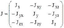 Момент инерции матер.точки относительно некоторой оси называется произведение массы m этой точки на квадрат ее расстояния h до оси: mh2. Момент инерции тела (системы) относительно оси Оz: Jz= åmkhk2. При непрерывном распределении масс (тело) сумма переходит в интеграл: Jx= ò(y2+z2)dm; Jy= ò(z2+x2)dm; Jz= ò(x2+y2)dm – относительно координатных осей. Jz= M×r2, r – радиус инерции тела – расстояние от оси до точки в которой нужно сосредоточить всего тела, чтобы ее момент инерции равнялся моменту инерции тела. Момент инерции относительно оси (осевой момент инерции) всегда >0. Полярный момент инерции Jo= ò(x2+y2+z2)dm; Jx+Jy+Jz= 2Jo. Центробежный момент инерции Jxy для матер.точки называется произведение ее координат x и y на ее массу m. Для тела центробежными моментами инерции называются величины, определяемые равенствами: Jxy=òxy dm; Jyz=òyz dm; Jzx=òzx dm. Центробежные моменты инерции симметричны относительно своих индексов, т.е. Jxy=Jyx и т.д. В отличие от осевых, центробежные моменты инерции могут иметь любой знак и обращаться в нуль. Главной осью инерции тела назыв. ось, для которой оба центробежных момента инерции, содержащие индекс этой оси, равны нулю. Например, если Jxz=Jyz=0, то ось z – главная ось инерции. Главной центральной осью инерции назыв. главная ось инерции, проходящая через центр масс тела. 1)Если тело имеет плоскость симметрии, то любая ось, перпендикулярная к этой плоскости, будет главной осью инерции тела для точки, в которой ось пересекает плоскость. 2)Если тело имеет ось симметрии, то эта ось является главной осью инерции тела (ось динамической симметрии). Размерность всех моментов инерции [кгм2] Центробежный момент инерции зависят не только от направления координатных осей, но и от выбора начала координат. Тензор инерции в данной точке: