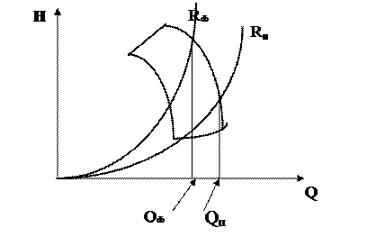 Рис.2.1 Производительность вентилятора Qп, Qф при работе на сеть с проектным сопротивлением Rп и фактическим Rф.
