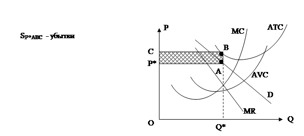 2) Минимизация убытков. Если выполняются условия AVC(Q) < P*(Q) ≤ ATC(Q), то фирма терпит убытки, но продолжает производство, т.к. это позволяет полностью покрыть переменные издержки и частично покрыть постоянные издержки.