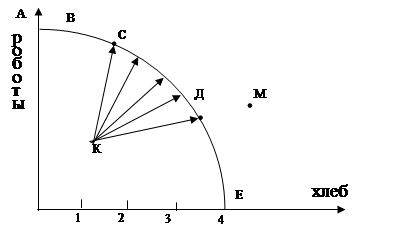 Каждая точка на кривой трансформации представляет некоторый максимальный объем производства 2-х продуктов. Какой из вариантов наилучший, доказать невозможно, так как этот вопрос относится не к науке – это нормативный вопрос, который решают власти. Если объем будет задан точкой К - это означает, что ресурсы используются не полностью и объем производства можно увеличить по всем направлениям. Если объем будет задан точкой М – это значит, что мы выбрали нереальный объем производства, достигнуть которого невозможно. Ограниченность ресурсов требует не только экономического, но и эффективного их использования. Степень эффективности их использования можно оценить на основе вмененных (альтернативных) издержек. Альтернативные издержки – это количество других товаров, от которого приходится отказаться, чтобы получить взамен какое-то количество данного товара. И таблица и график трансформации показывают, что выпуск каждой дополнительной единицы хлеба стоит все большего количества единиц роботов, которыми приходится жертвовать, а это значит, что затраты на производство каждой дополнительной единицы продукции имеют тенденцию к росту, то есть в обществе действует закон возрастающих затрат. Закон возрастающих затрат тесно связан с законом убывающей доходности. Этот закон относится к выпуску дополнительной продукции, которую можно получить путем добавления равных дополнительных единиц, изменяющихся затрат к неизмененному количеству некоторых других затрат. Доход, выраженный в пшенице, когда дополнительные затраты труда добавляются к неизменному количеству земли.