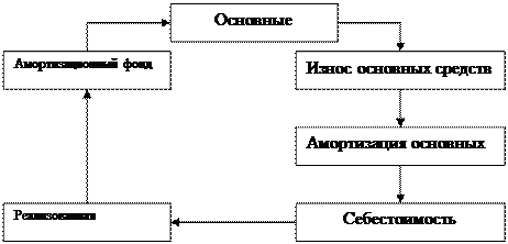 Основными источниками покрытия затрат, связанных с обновлением основного капитала, являются собственные средства предприятия. Они накапливаются в течение всего срока службы основного капитала в виде амортизационных отчислений. А именно, износ основных средств возмещается путём постепенного включения их стоимости в виде амортизационных отчислений в издержки производства. Таким образом, амортизация – это денежное возмещение износа основных средств и нематериальных активов путём включения части их стоимости в затраты на выпускаемую продукцию. Амортизация есть денежное выражение их физического и морального износа. Она осуществляется в целях полной замены средств труда при их выбытии. Сумма амортизационных отчислений зависит от стоимости основных средств и нематериальных активов (т.е. амортизируемой стоимости) и норм амортизации. Амортизируемая стоимость (АС) – стоимость, по которой объекты основных средств числятся в бухгалтерском учете за вычетом ликвидационной стоимости. Определяется по формуле АС = Фп – Фл, где Фп – первоначальная стоимость объекта основных средств; Фл – ликвидационная стоимость объекта. В некоторых случаях ликвидационная стоимость может быть равна нулю, тогда амортизируемая стоимость равна первоначальной, а после проведения переоценки объекта основных средств – восстановительная стоимость. Нормы амортизации показывают, какую долю (процент) своей амортизируемой стоимости ежегодно переносят средства труда на создаваемую ими продукцию. Период начисления амортизации зависит от срока полезного использования средств труда, который определяется нормативным сроком службы. Срок службы – период, в течение которого объект основных средств или нематериальных активов сохраняет свои потребительские свойства. Нормативный срок службы устанавливается правовыми актами или на основе технической документации (технического паспорта на машины, механизмы, оборудования) и других документов. Норма амортизации каждого объекта основных средств и нематериальных активов рассчитывается как величина обратная нормативному сроку службы объекта. На основании «Положения о порядке начисления амортизации основных средств и нематериальных активов» (вступившего в силу с 1-го января 2002г.) нормы амортизации устанавливаются предприятиями самостоятельно в соответствии с диапазонными сроками полезного использования, которые приведены в данном документе. Например, по зданиям и сооружениям низкой капиталоёмкости срок полезного использования составляет от 5 до 15 лет, высокой капиталоёмкости от 50 до 80 лет. Для машин, механизмов этот срок равен от5 до30 лет, а вычислительной техники – от 3 до 14 лет. В соответствии с этими сроками устанавливаются и диапазонные нормы амортизации. Начисление амортизации производится с первого числа месяца следующего за месяцем ввода объекта в эксплуатацию. На предприятиях амортизационные отчисления ежемесячно начисляются и включаются в себестоимость продукции. После реализации продукции образуется амортизационный фонд. Процесс амортизации и простого воспроизводства можно представить в виде следующей схемы (рис. 3):