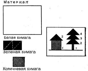 3. Ориентировка в задании. Анализ образца проводится по вопросам учителя. Определяется тема аппликации, расположе­ние предметов на листе бумаги, геометрические фигуры, состав­ляющие елку и домик, их цвет и количество. Указываются ма­териалы и инструменты. Учащиеся с помощью учителя вспоми­нают способы заготовки прямоугольных деталей: обводка по шаблону и складывание из полосы бумаги.