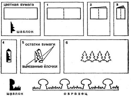 Оборудование и наглядные пособия. Образец из­делия, листы плотной белой бумаги, полосы зеленой и коричне­вой бумаги, ножницы, кисточки, клей, подкладные доски, тря­почки, коробки для обрезков.