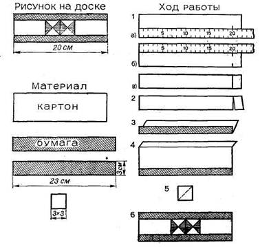 4. Составление плана работы. Учащиеся подобные изделие выполняют впервые. Поэтому организует коллективное составление плана по предметной карте. Он следит за тем, чтобы отвечающие точно указывали, во сколько раз складывается полоска бумаги, как располагается шаблон, где соединяются фигурки. Затем он объясняет, как образуется соединение фигурок. В ходе ответов учащиеся должны также назвать инст­рументы и приспособления.