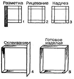 6. Составление плана работы, ориентируясь по предметной карте. Карта должна отражать основные операции: разметку по шаблону, нанесение рицовки, надрез квадратов (клапанов) по долевой стороне развертки, складывание коробки, приклеи­вание клапанов.