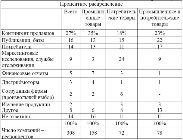В следующих таблицах приведены результаты исследований (Нью-Йорк, 1988 г.4) значительного числа крупных компаний, работающих на индустриальном и потребительском рынках. Таблица 9.5 Наиболее ценные источники информации (по типам рынков)