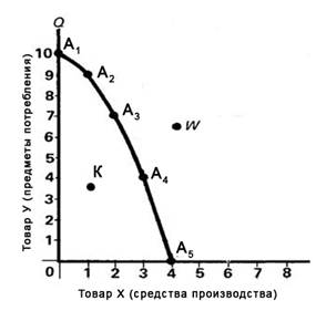 При ее построении предполагаются следующие условия. I. Эффективность. Экономика функционирует в условиях полного и эффективного использования всех ресурсов. Последнее означает получение максимального объема продукции от данного объема затрат. П. Постоянное количество ресурсов. Имеющиеся факторы производства неизменны как по количеству, так и по качеству. III. Неизменная технология. В ходе нашего анализа исключается технический прогресс. IV. Допускаем, что экономика производит не бесчисленное множество товаров и услуг, а два абстрактных продукта; средства труда и предметы потребления. Каждая точка на кривой производственных возможностей представляет собой максимальный объем производства двух продуктов при полном использовании всех имеющихся ресурсов. Каждая точка на кривой характеризует определенную комбинацию товаров этих двух видов. Точки, расположенные вне кривой (W), характеризуют недостижимый выпуск продукции при полном использовании ресурсов и существующей технологии. Точки внутри кривой (К) показывают неполное или неэффективное использование ресурсов. Всякое увеличение производства предметов потребления предполагает уменьшение производства средств труда. Двигаясь в этом направлении, общество увеличивает удовлетворение своих текущих потребностей. Однако такая политика дорого обходится. Переключение ресурсов в пользу потребительского сектора со временем нанесет удар самому обществу, так как потенциал будущего производства снижается.